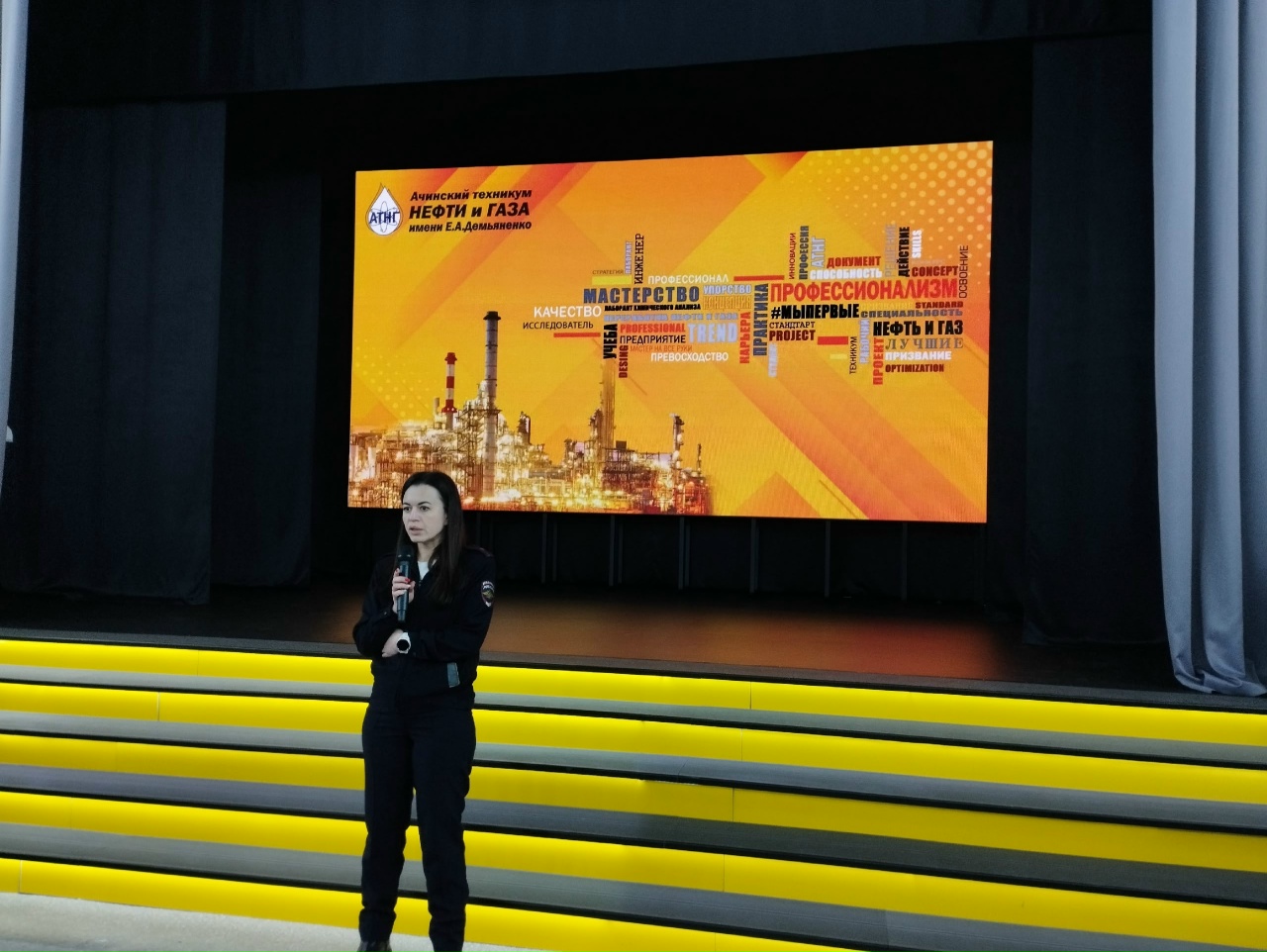 В прошедшую неделю студенты Ачинского техникума нефти и газа имени Е.А. Демьяненко встретились с представителями правоохранительных органов для проведения важного мероприятия — профилактической беседы по обеспечению личной безопасности молодежи. В роли спикера выступила старший инспектор ГпДН линейного отдела Министерства внутренних дел России на станции Ачинск Анастасия Витальевна Витковская, которая провела содержательную лекцию на тему правил безопасного поведения как в реальной жизни, так и виртуальном пространстве.