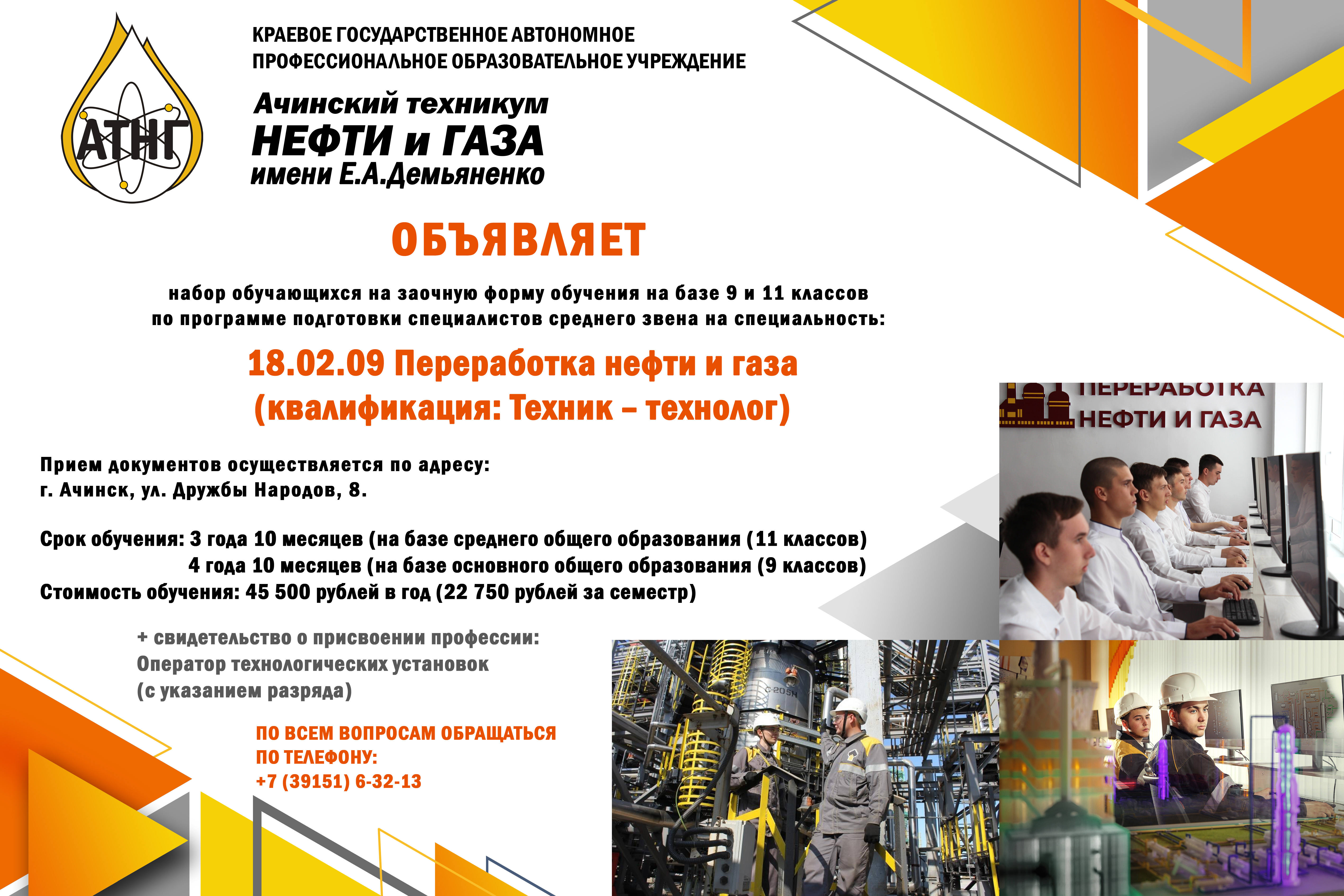 Ачинский техникум нефти и газа имени Е.А. Демьяненко приглашает Вас на заочное отделение по специальности 18.02.09 Переработка нефти и газа.