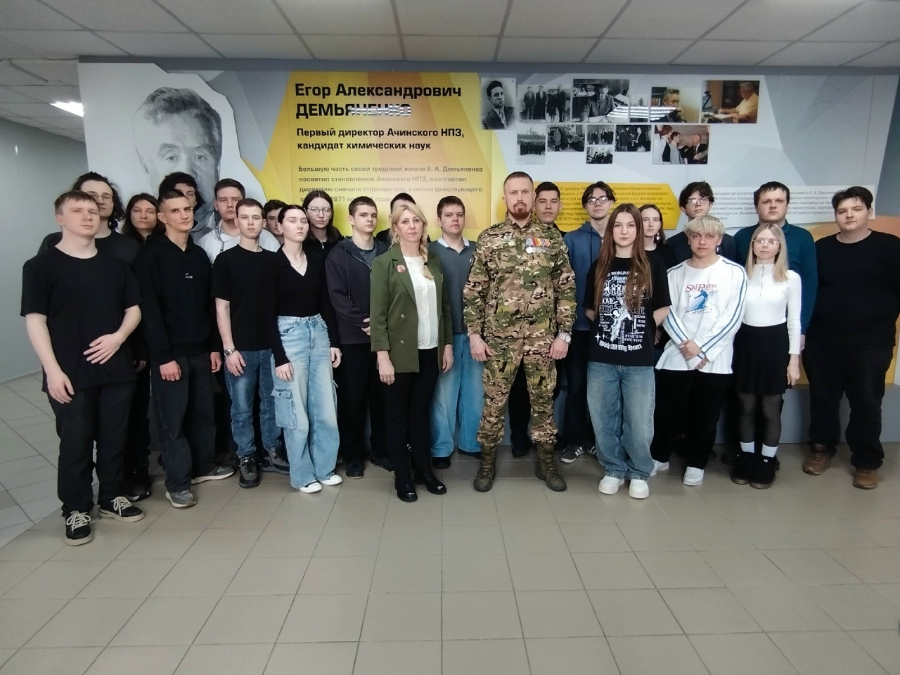 Сегодня, 27 марта, в Ачинском техникуме нефти и газа прошла особенная встреча — студенты смогли пообщаться с Борисом Вячеславовичем Филипповым - участником специальной военной операции и Еленой Олеговной Попковой, активистом общественного объединения "МаскСети Ачинск".