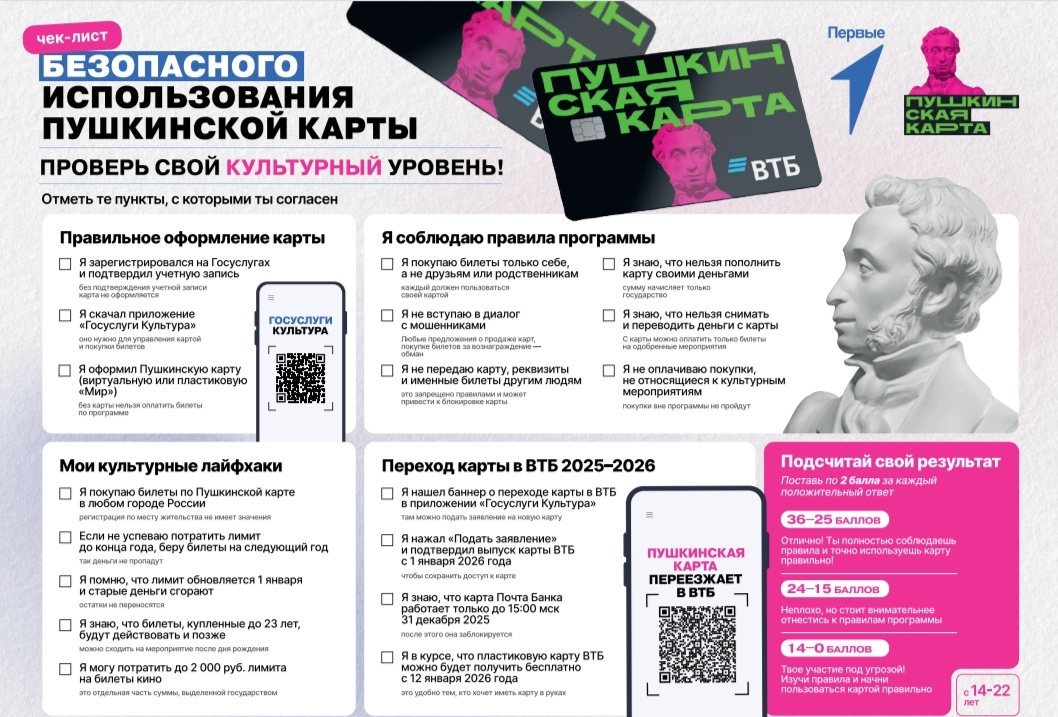 Общероссийское общественно-государственное движение детей и молодежи «Движение первых» совместно с Министерством просвещения Российской Федерации подготовили специальную памятку-памятку для самопроверки гражданами уровня осведомленности о правилах безопасного пользования картой программы «Пушкинская карта».